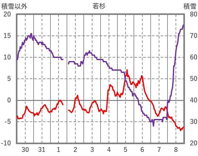 | 日 | 時 | 気温 | 降水 | 風向/風速 | 日照 | 積雪 | 降雪 |