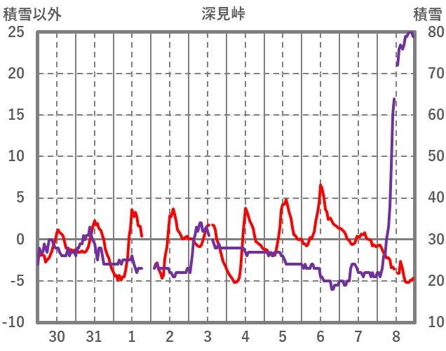 | 日 | 時 | 気温 | 降水 | 風向/風速 | 日照 | 積雪 | 降雪 |