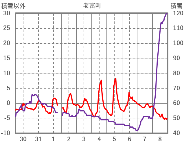 | 日 | 時 | 気温 | 降水 | 風向/風速 | 日照 | 積雪 | 降雪 |