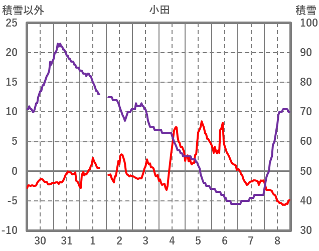 | 日 | 時 | 気温 | 降水 | 風向/風速 | 日照 | 積雪 | 降雪 |