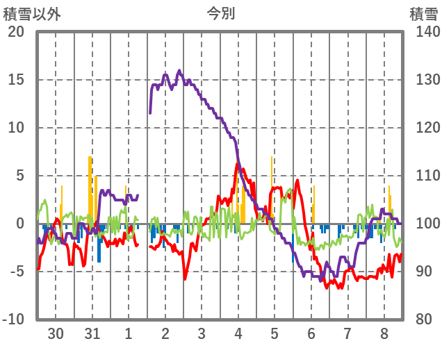 | 日 | 時 | 気温 | 降水 | 風向/風速 | 日照 | 積雪 | 降雪 |