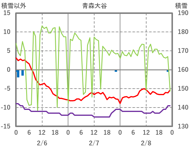 | 日 | 時 | 気温 | 降水 | 風向/風速 | 日照 | 積雪 | 降雪 |