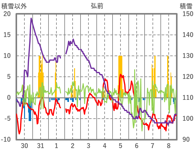 | 日 | 時 | 気温 | 降水 | 風向/風速 | 日照 | 積雪 | 降雪 |