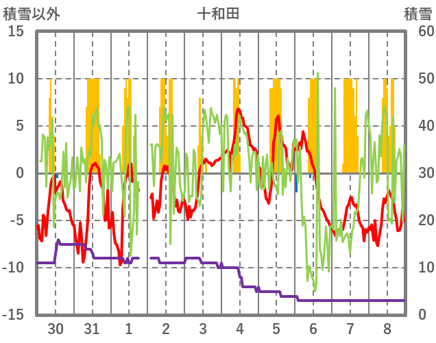 | 日 | 時 | 気温 | 降水 | 風向/風速 | 日照 | 積雪 | 降雪 |