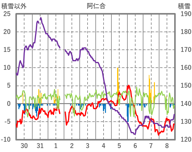 | 日 | 時 | 気温 | 降水 | 風向/風速 | 日照 | 積雪 | 降雪 |