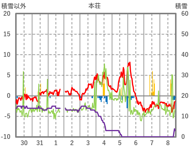 | 日 | 時 | 気温 | 降水 | 風向/風速 | 日照 | 積雪 | 降雪 |