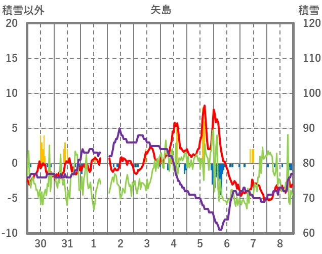 | 日 | 時 | 気温 | 降水 | 風向/風速 | 日照 | 積雪 | 降雪 |
