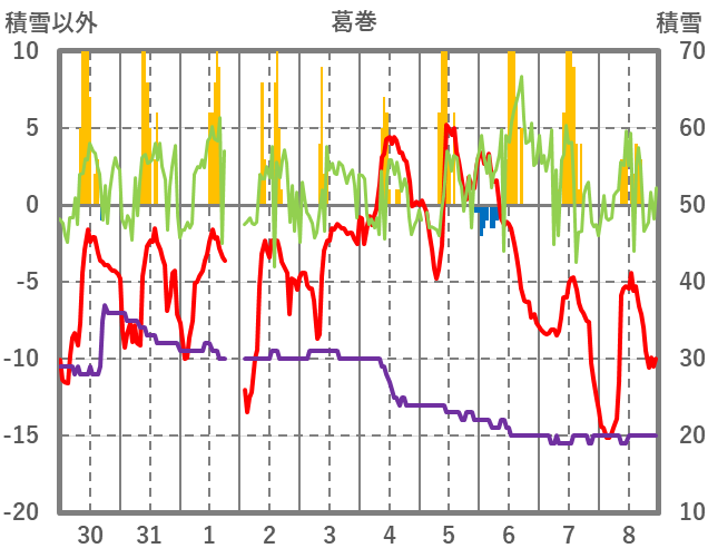 | 日 | 時 | 気温 | 降水 | 風向/風速 | 日照 | 積雪 | 降雪 |