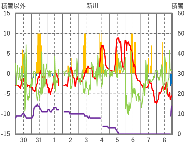 | 日 | 時 | 気温 | 降水 | 風向/風速 | 日照 | 積雪 | 降雪 |