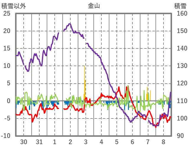 | 日 | 時 | 気温 | 降水 | 風向/風速 | 日照 | 積雪 | 降雪 |