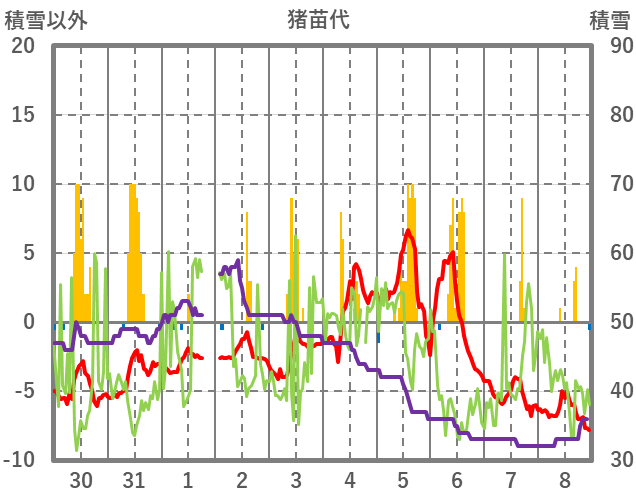 | 日 | 時 | 気温 | 降水 | 風向/風速 | 日照 | 積雪 | 降雪 |