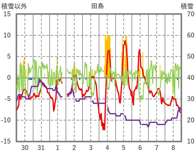 | 日 | 時 | 気温 | 降水 | 風向/風速 | 日照 | 積雪 | 降雪 |