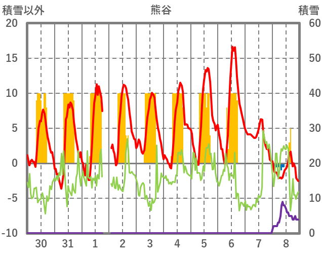 | 日 | 時 | 気温 | 降水 | 風向/風速 | 日照 | 積雪 | 降雪 |