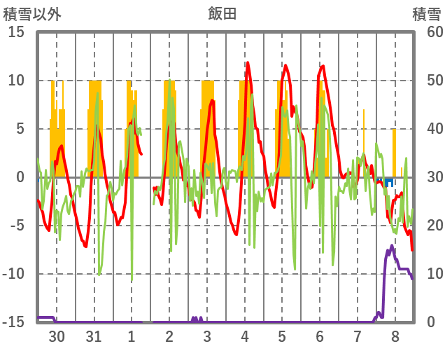 | 日 | 時 | 気温 | 降水 | 風向/風速 | 日照 | 積雪 | 降雪 |
