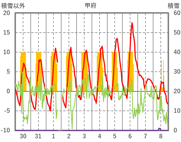 | 日 | 時 | 気温 | 降水 | 風向/風速 | 日照 | 積雪 | 降雪 |