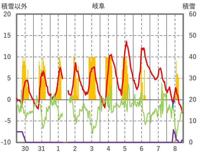 | 日 | 時 | 気温 | 降水 | 風向/風速 | 日照 | 積雪 | 降雪 |
