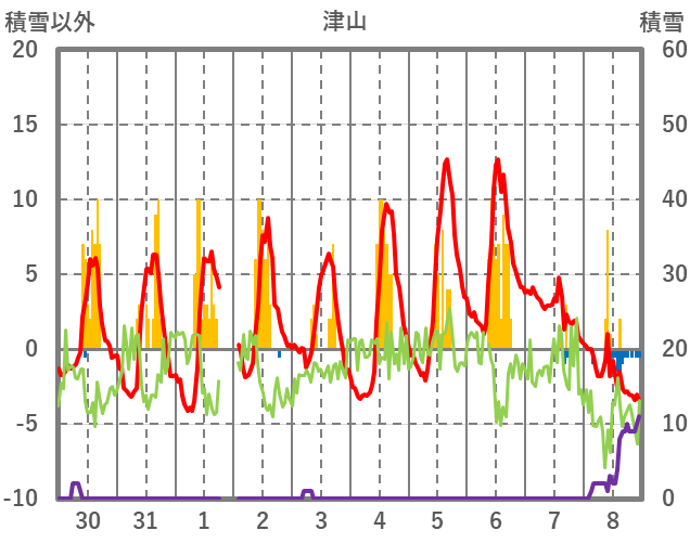 | 日 | 時 | 気温 | 降水 | 風向/風速 | 日照 | 積雪 | 降雪 |