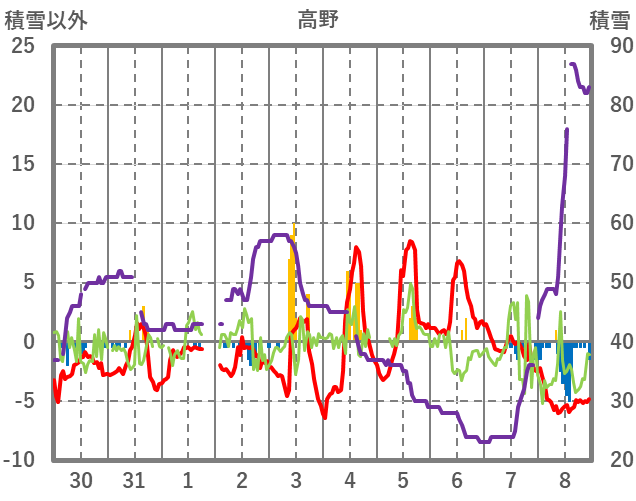 | 日 | 時 | 気温 | 降水 | 風向/風速 | 日照 | 積雪 | 降雪 |