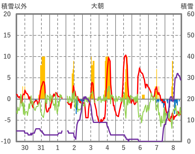 | 日 | 時 | 気温 | 降水 | 風向/風速 | 日照 | 積雪 | 降雪 |