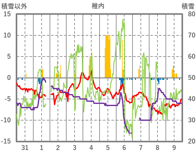 | 日 | 時 | 気温 | 降水 | 風向/風速 | 日照 | 積雪 | 降雪 |