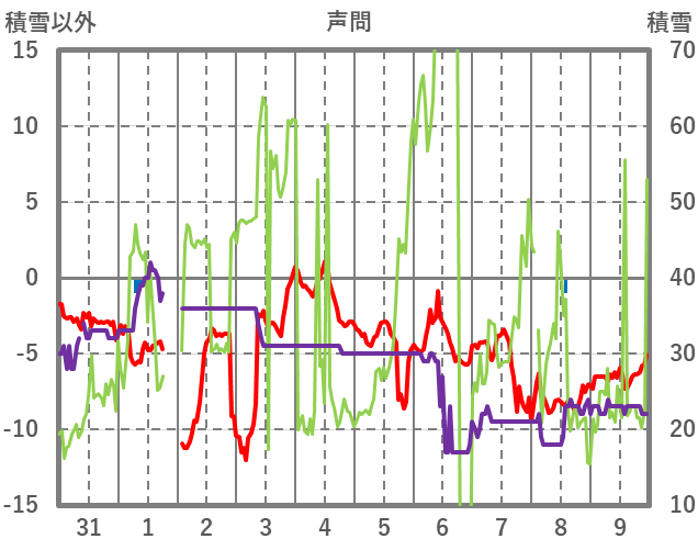 | 日 | 時 | 気温 | 降水 | 風向/風速 | 日照 | 積雪 | 降雪 |