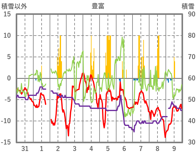 | 日 | 時 | 気温 | 降水 | 風向/風速 | 日照 | 積雪 | 降雪 |