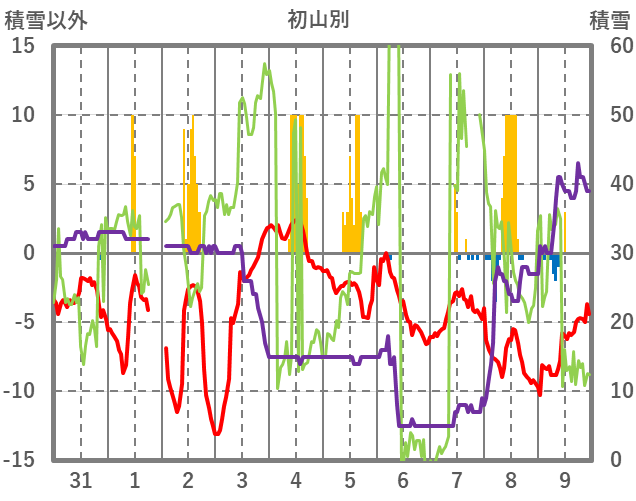 | 日 | 時 | 気温 | 降水 | 風向/風速 | 日照 | 積雪 | 降雪 |