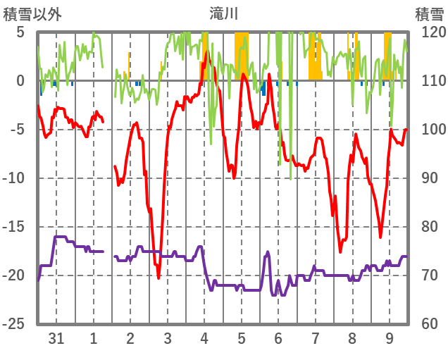 | 日 | 時 | 気温 | 降水 | 風向/風速 | 日照 | 積雪 | 降雪 |
