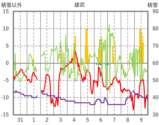 | 日 | 時 | 気温 | 降水 | 風向/風速 | 日照 | 積雪 | 降雪 |