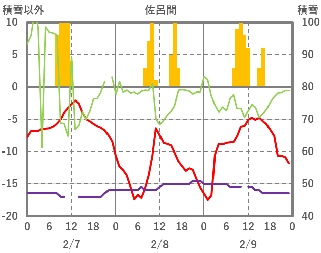 | 日 | 時 | 気温 | 降水 | 風向/風速 | 日照 | 積雪 | 降雪 |