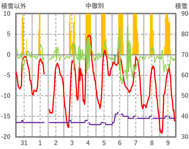 | 日 | 時 | 気温 | 降水 | 風向/風速 | 日照 | 積雪 | 降雪 |