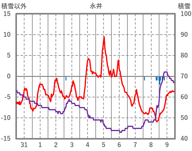 | 日 | 時 | 気温 | 降水 | 風向/風速 | 日照 | 積雪 | 降雪 |