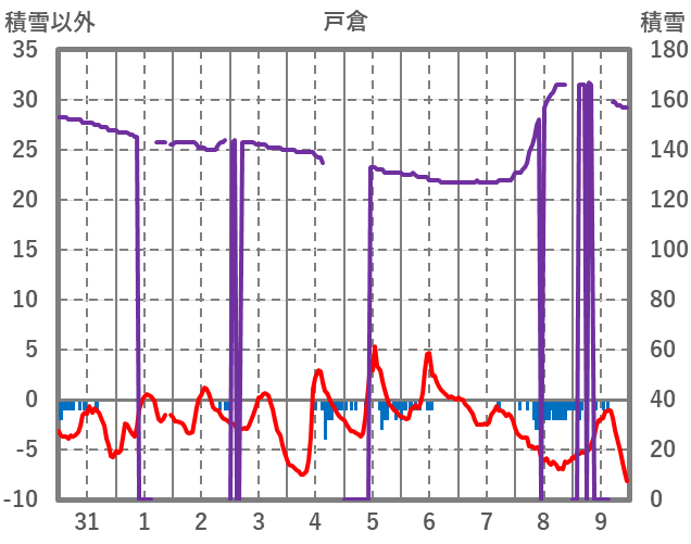 | 日 | 時 | 気温 | 降水 | 風向/風速 | 日照 | 積雪 | 降雪 |