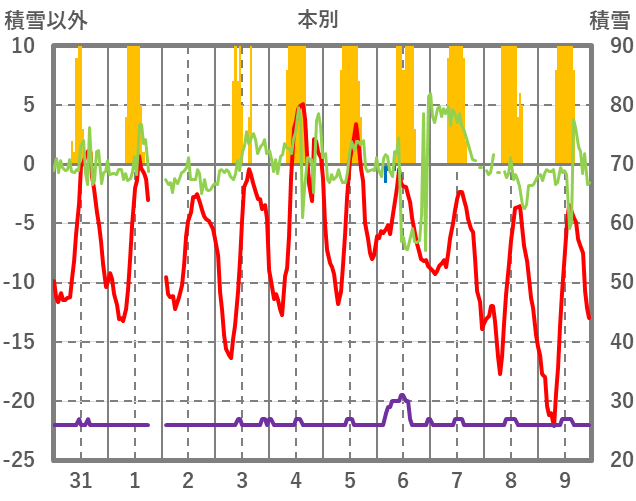 | 日 | 時 | 気温 | 降水 | 風向/風速 | 日照 | 積雪 | 降雪 |