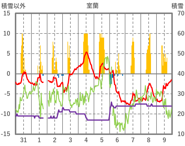 | 日 | 時 | 気温 | 降水 | 風向/風速 | 日照 | 積雪 | 降雪 |
