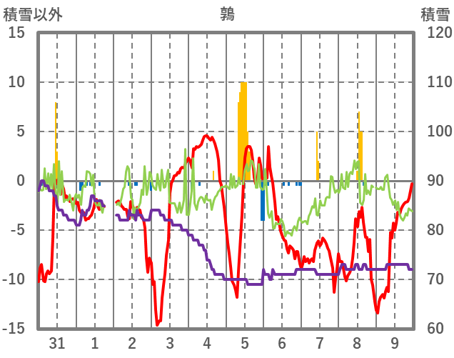 | 日 | 時 | 気温 | 降水 | 風向/風速 | 日照 | 積雪 | 降雪 |