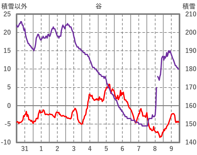 | 日 | 時 | 気温 | 降水 | 風向/風速 | 日照 | 積雪 | 降雪 |