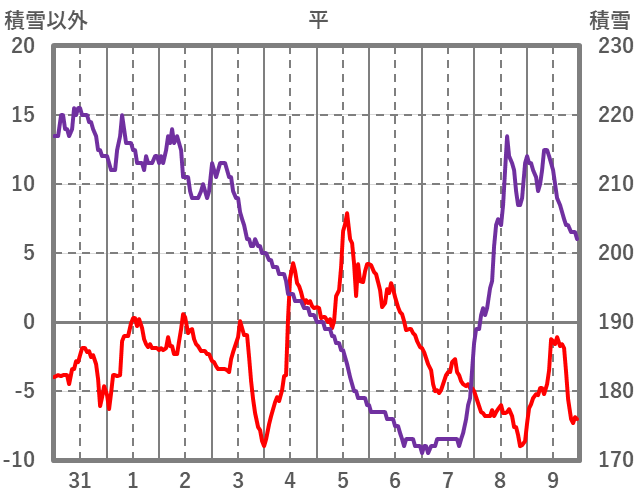 | 日 | 時 | 気温 | 降水 | 風向/風速 | 日照 | 積雪 | 降雪 |