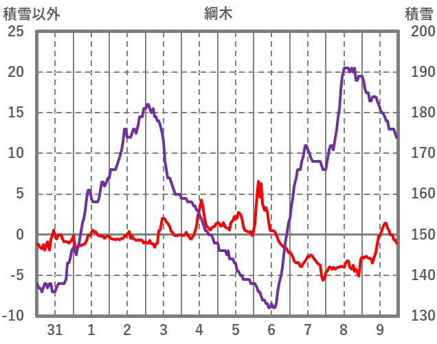 | 日 | 時 | 気温 | 降水 | 風向/風速 | 日照 | 積雪 | 降雪 |
