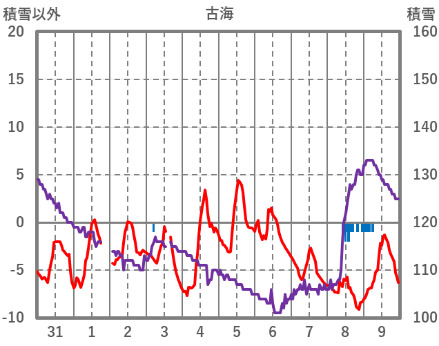 | 日 | 時 | 気温 | 降水 | 風向/風速 | 日照 | 積雪 | 降雪 |