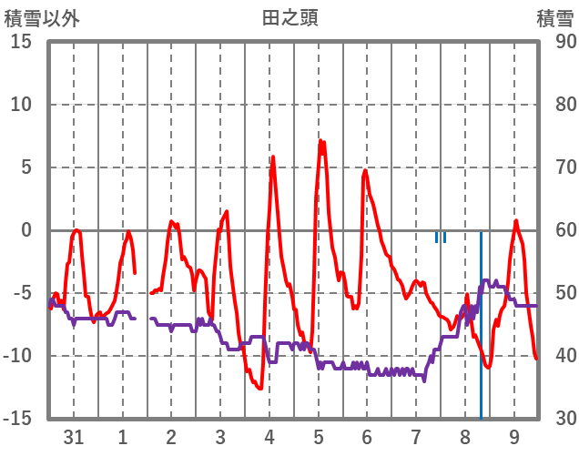 | 日 | 時 | 気温 | 降水 | 風向/風速 | 日照 | 積雪 | 降雪 |