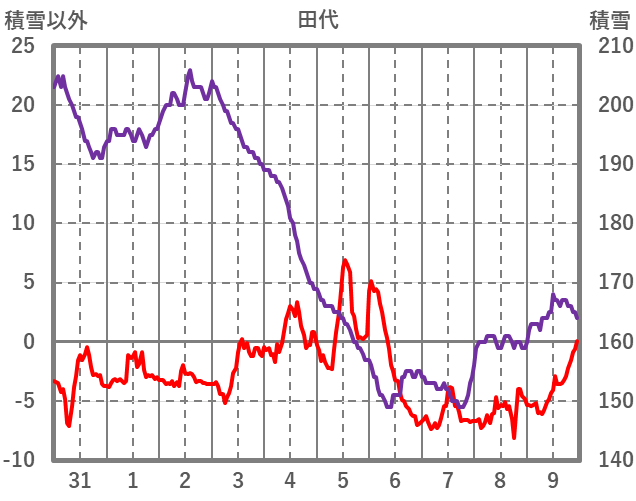 | 日 | 時 | 気温 | 降水 | 風向/風速 | 日照 | 積雪 | 降雪 |