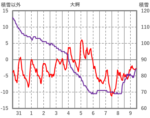 | 日 | 時 | 気温 | 降水 | 風向/風速 | 日照 | 積雪 | 降雪 |