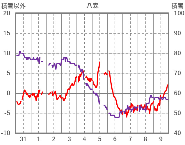 | 日 | 時 | 気温 | 降水 | 風向/風速 | 日照 | 積雪 | 降雪 |