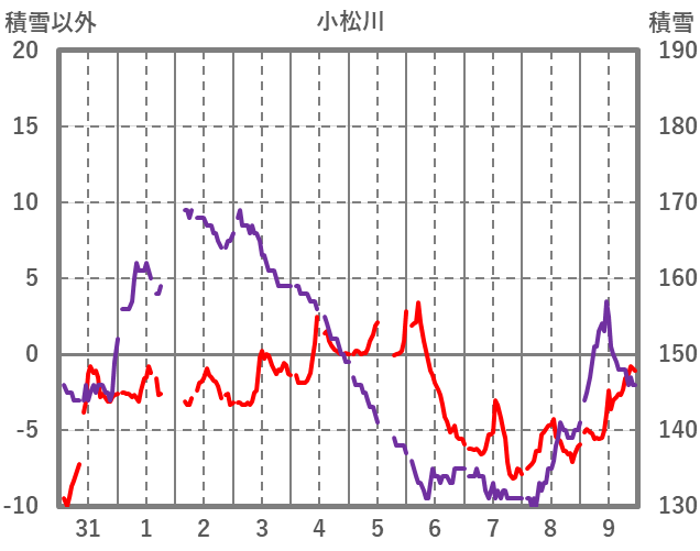 | 日 | 時 | 気温 | 降水 | 風向/風速 | 日照 | 積雪 | 降雪 |