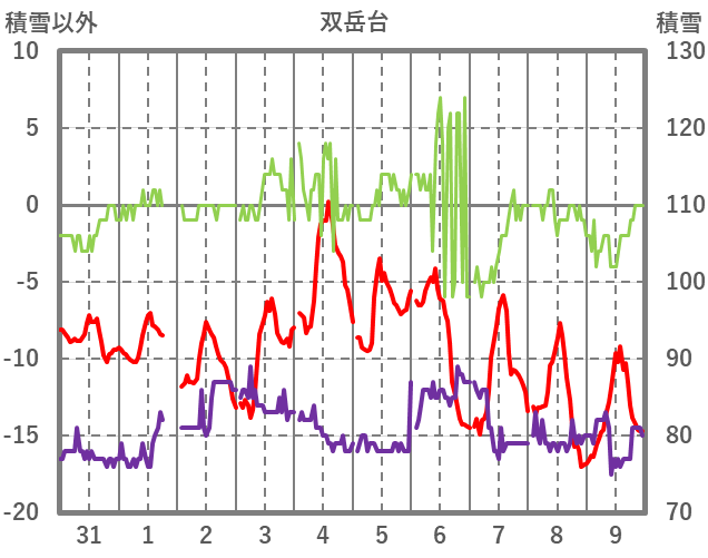 | 日 | 時 | 気温 | 降水 | 風向/風速 | 日照 | 積雪 | 降雪 |