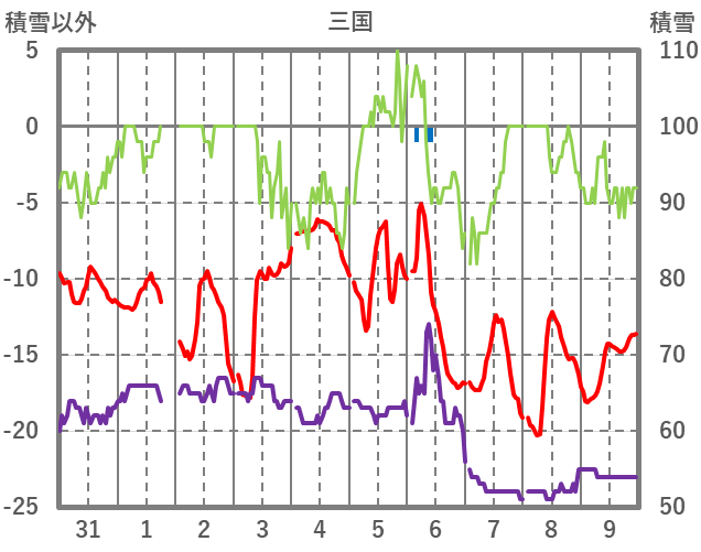 | 日 | 時 | 気温 | 降水 | 風向/風速 | 日照 | 積雪 | 降雪 |