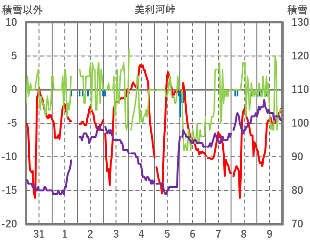 | 日 | 時 | 気温 | 降水 | 風向/風速 | 日照 | 積雪 | 降雪 |