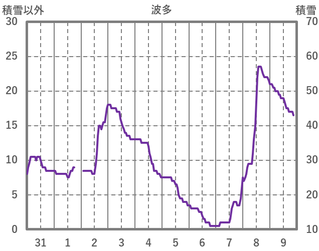 | 日 | 時 | 気温 | 降水 | 風向/風速 | 日照 | 積雪 | 降雪 |