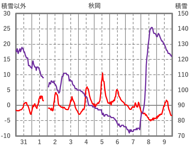 | 日 | 時 | 気温 | 降水 | 風向/風速 | 日照 | 積雪 | 降雪 |